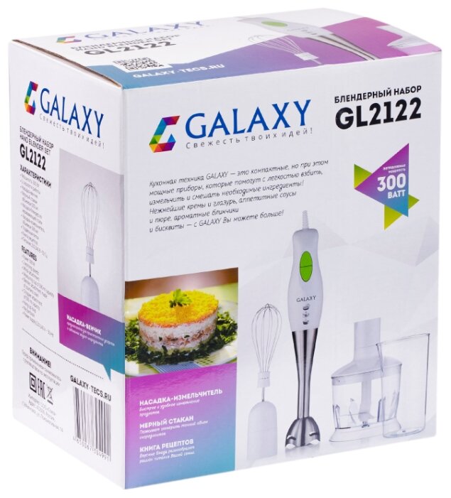 Galaxy GL 2122 — это удобный блендер, с помощью которого вы сможете измельчить или перемешать различные ингредиенты при приготовлении молочных или фруктовых коктейлей, овощных пюре и других блюд. Модель имеет 2 скоростных режима, которые удобно переключать, поскольку все кнопки находятся на ручке. Набор GL2122 поможет вам приготовить большое количество блюд, благодаря различным насадкам.