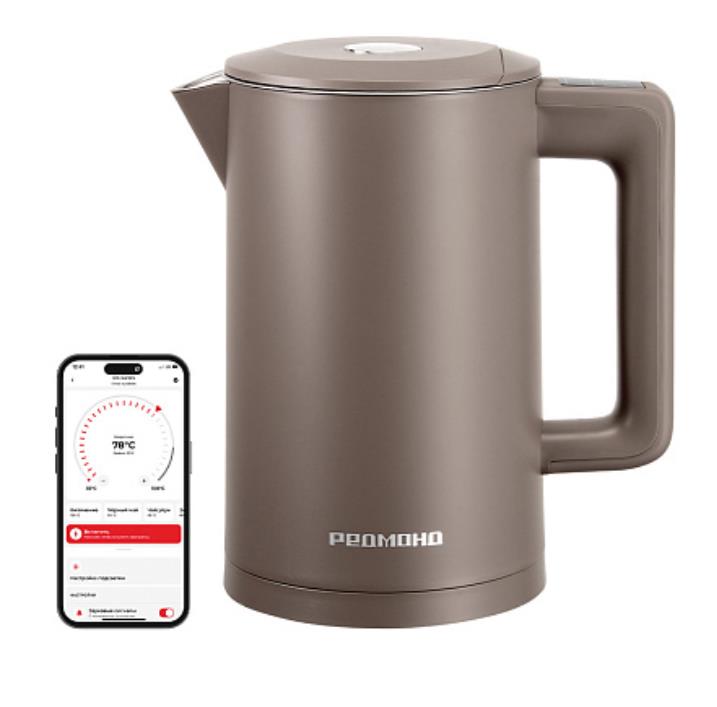 REDMOND SkyKettle KM231S — удобный чайник серо-коричневого цвета, работу которого можно контролировать с помощью мобильного телефона из любой части планеты. Его цельнометаллическая колба и двойные стенки обеспечивают безопасность и эффективность использования. Благодаря функции точной настройки температуры до 1 °C (настраивается через приложение), вы сможете заварить любой напиток идеально.