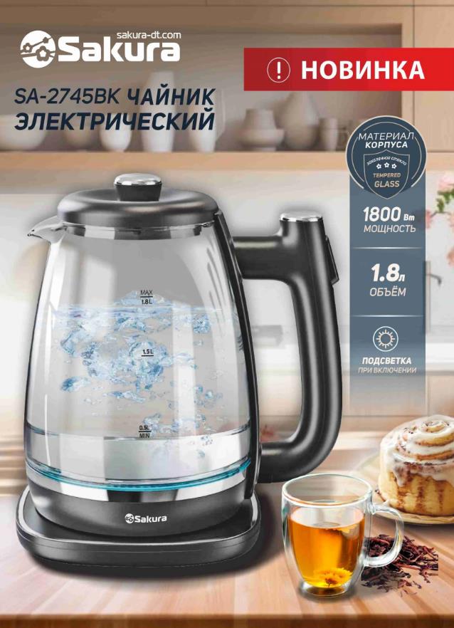 Электрический чайник Sakura SA-2745BK (1800 Вт/1,8 л /стекло, пластик/прозрачный, черный) - Интернет-магазин Электроника: бытовая техника, электроника, товары для дома и др.