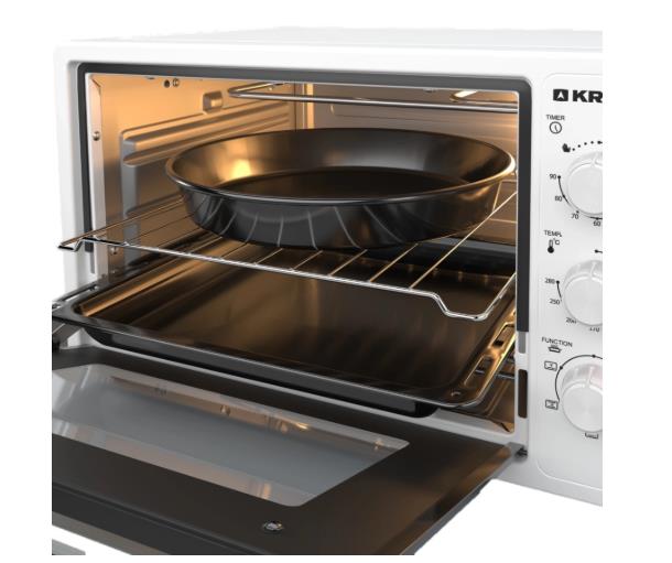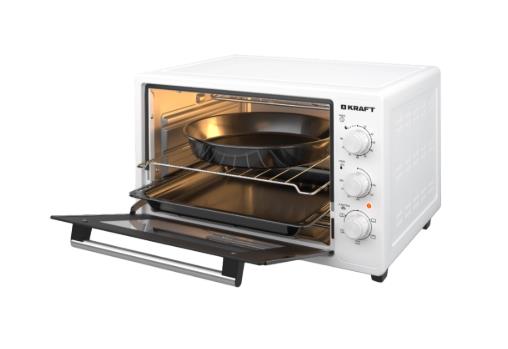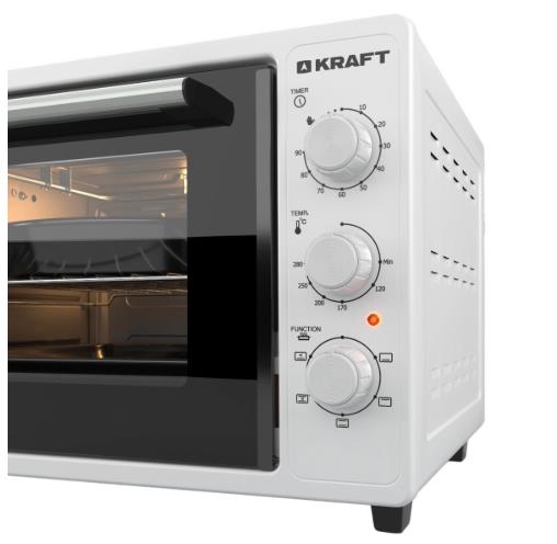 Мини-печь KRAFT объёмом 40 литров. Мини-печь работает в 5 автоматических режимах, с помощью которых можно приготовить и разогреть разнообразные блюда. Мощность 1400 Вт обеспечивает быстрый нагрев. Максимальная температура нагрева 280 C и хорошая теплоизоляция подходит для выпечки хлеба, мясных и рыбных блюд. Поворотные переключатели способствуют быстрому выбору и легкой установке параметров готовки. Благодаря дверце из закаленного стекла и внутренней подсветке вы с легкостью сможете контролировать приготовление блюда. Таймер со звуковым сигналом уведомляет о завершении процесса. В комплект входят: прямоугольный противень, круглый противень и решетка.