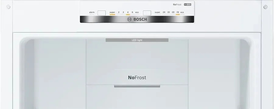 Двухкамерный холодильник Bosch KGN39UW30U современный бытовой агрегат сочетает лаконичный белый корпус и функциональную начинку, рассчитанную на комфорт ежедневного использования. Высота 203 см, ширина 60 см и глубина 66 см делают прибор заметным, но не громоздким — он легко вписывается в стандартную кухонную нишу и допускает установку вплотную к стене. Встроенная вертикальная ручка и правый дверной упор придают фасаду строгую аккуратность, а возможность перенавешивания створки обеспечивает гибкость расположения при перестановке мебели. Корпус отличается продуманными габаритами и весом 69 кг, демонстрируя добротную сборку и устойчивость при эксплуатации. Внутреннее пространство организовано для рационального распределения запасов: общий полезный объём заявлен 366 л, при этом холодильная камера предоставляет 290 л полезного места, а морозильный отсек — 110 л для длительного хранения. Для удобства доступны четыре основных полки, три из которых регулируются по высоте, и одна фиксированная; поверхности выполнены из прочного безопасного стекла, а выдвижные полки EasyAccess облегчают доступ к продуктам, расположенным на задней части полок. На дверце размещены четыре полочки для бутылок и соусов, а также три подставки для яиц — всё для грамотной организации рациона и оптимального использования объёма.