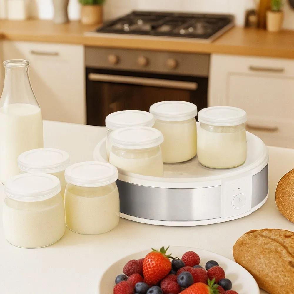 В наборе 7 пластиковых баночек по 180 мл с герметичными крышками для сохранения свежести йогурта. Йогуртница обеспечивает равномерный нагрев, поддерживая оптимальную температуру для ферментации и получения густого, однородного йогурта.