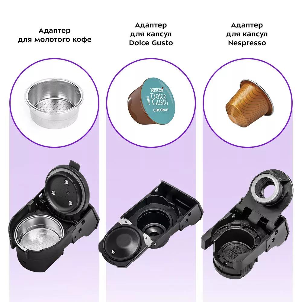 Кофеварка «3 в 1» КТ-7107 — многофункциональное устройство, сочетающее в себе функции кофемолки, капсульной и рожковой кофеварки. Кофеварка поможет приготовить кофе эспрессо, американо или лунго, а также множество других видов кофе на ваш вкус. Благодаря 3 адаптерам, которые входят в комплект, кофеварка подходит для капсул типа Nespresso и Dolce Gusto, а также для молотого кофе. Она прекрасно совмещает в себе все преимущества каждого типа кофеварок и готовит под давлением 19 бар.