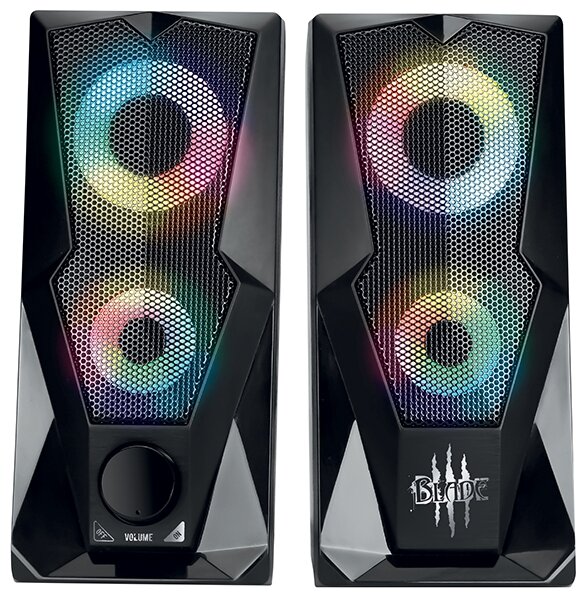 Колонки 2.0 Qumo Blade AS001 при мощности 6 Вт обладают небольшими размерами (17.5x7.8x9.9 см), что позволяет разместить их на компьютерном столе. Корпуса изделий изготовлены из пластика и создают акустическое оформление «закрытый ящик». Диапазон частот звучания динамиков фронтальных колонок диаметром 63 мм варьируется от 160 до 20000 Гц с сопротивлением 30 дБ. К компьютеру устройство подключается за счет USB-порта. Звучание колонок 2.0 Qumo Blade AS001 сопровождается подсветкой. На корпусе колонок располагается регулятор громкости.