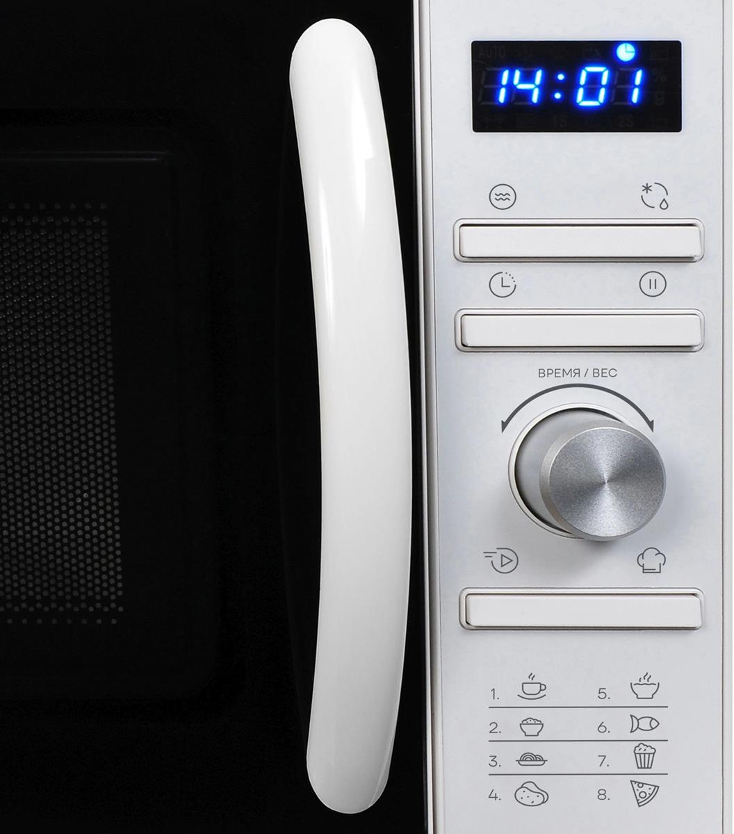 Vitek VT-MW0320 — компактная отдельностоящая микроволновая печь для ежедневной кухни. Камера 20 л рассчитана на тарелки стандартного диаметра и высокие чашки, стеклянный поворотный стол 245 мм равномерно распределяет микроволны в центре и по краям. Выходная мощность 700 Вт обеспечивает динамичный разогрев без сложных настроек, внутренняя подсветка и полноразмерная стеклянная дверца дают хороший обзор процесса. Белый корпус визуально облегчает фасад, а аккуратная панель с LED дисплеем и часами выглядит современно и читабельно.