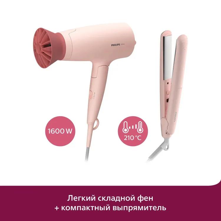 Набор для укладки волос Philips BHP398/00, компактный + выпрямитель (1600 Вт /розовый)