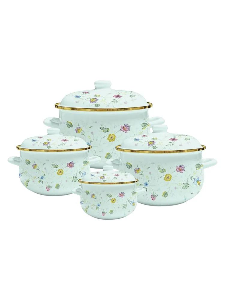 8 предметов: 4 эмалированные кастрюли 4 эмалированные крышки Размеры: Ø 16 | h-10.3 см | 1.5 л Ø 20 | h-13.0 см | 3.0 л Ø 24 | h-15.0 см | 5.5 л Ø 26 | h-16.0 см | 6.5 л