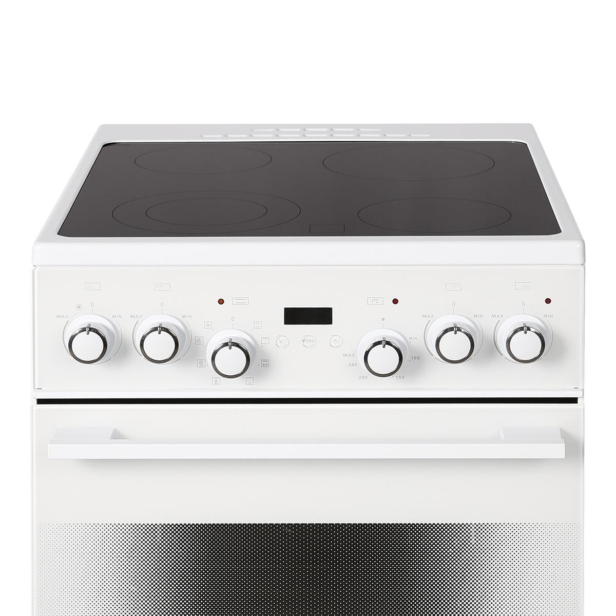 Электрическая плита выполнена в классическом белом цвете, что делает её универсальной для любого интерьера. Стеклокерамическая варочная поверхность шириной 50 см не только выглядит стильно, но и легко чистится. Механическое управление позволяет точно регулировать температуру и режимы работы.