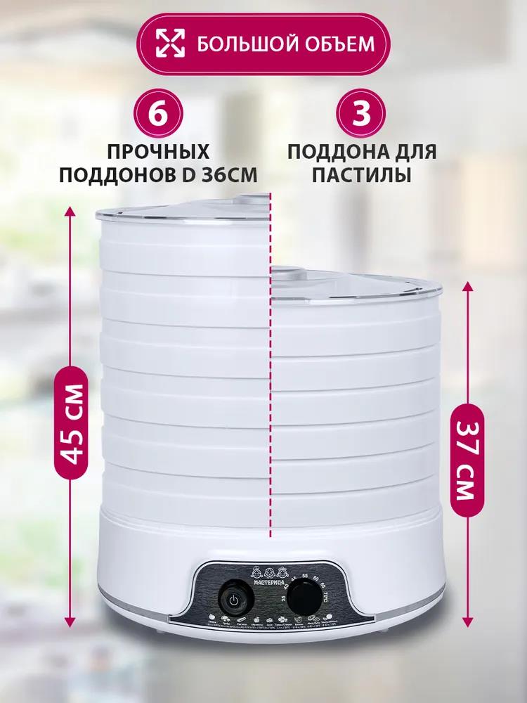 Сушилка для овощей Мастерица EFD-5000, 6 белых поддонов + 3 поддона д/пастилы 500Вт, увеличенный D поддона 36 см (поддонов 6 шт, 500 Вт , белый)