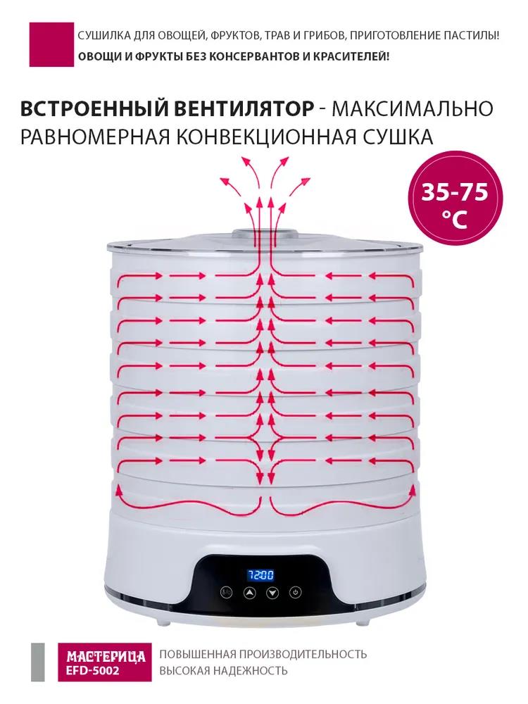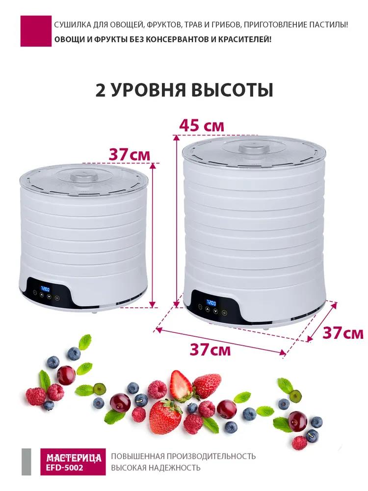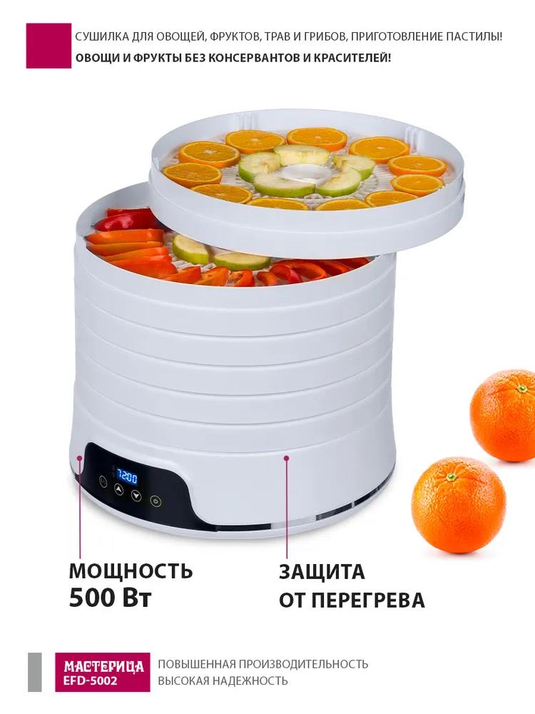 Сушилка для овощей Мастерица EFD-5002, 6 бел. поддонов + 3 поддона д/пастилы 500Вт, увелич. D поддона 36 см (поддонов 6 шт, 500 Вт , белый)