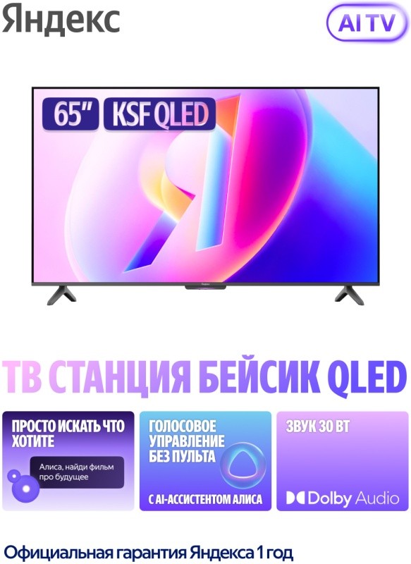 Яндекс ТВ Станция Бейсик QLED — базовый AI-телевизор Яндекса с ярким QLED-экраном и двухполосным звуком до 30 Вт. Мгновенно находите самое интересное, интуитивно управляйте голосом¹, получайте удовольствие от исключительного качества изображения и звука, пользуйтесь телевизором как умной колонкой — так впечатляюще просто.