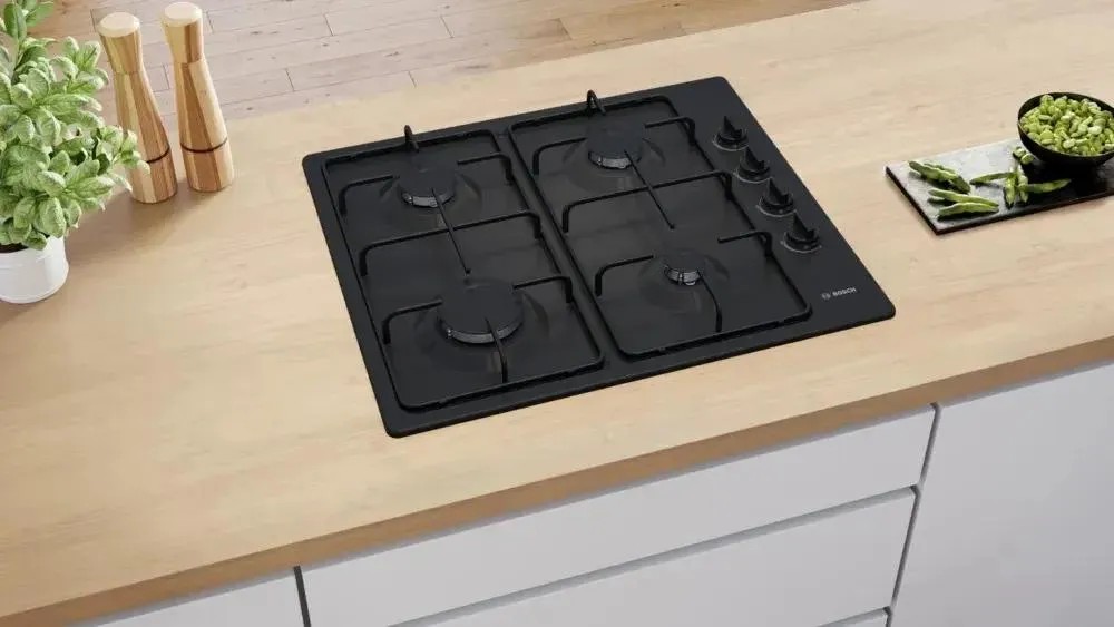 Газовая варочная панель Bosch PBP6C6K80Q продумана для практичных пользователей: четыре конфорки распределены так, чтобы обеспечить разнообразные режимы приготовления — мощная передняя левая зона 3 кВт подходит для быстрого кипячения и жарки, а задняя левая и задняя правая по 1.75 кВт удобны для тушения и поддержания температуры; передняя правая 1 кВт идеальна для деликатной термообработки и нагрева. Суммарная мощность устройств достигает 7.5 кВт, что обеспечивает быструю готовность и стабильную работу при одновременном использовании нескольких секций. Для безопасной эксплуатации предусмотрена термоэлектрическая защита газ-контроля, автоматически перекрывающая подачу топлива в случае погасания пламени, а автоматический электроподжиг интегрирован в поворотные органы управления, обеспечивая мгновенное воспламенение без применения сторонних средств.